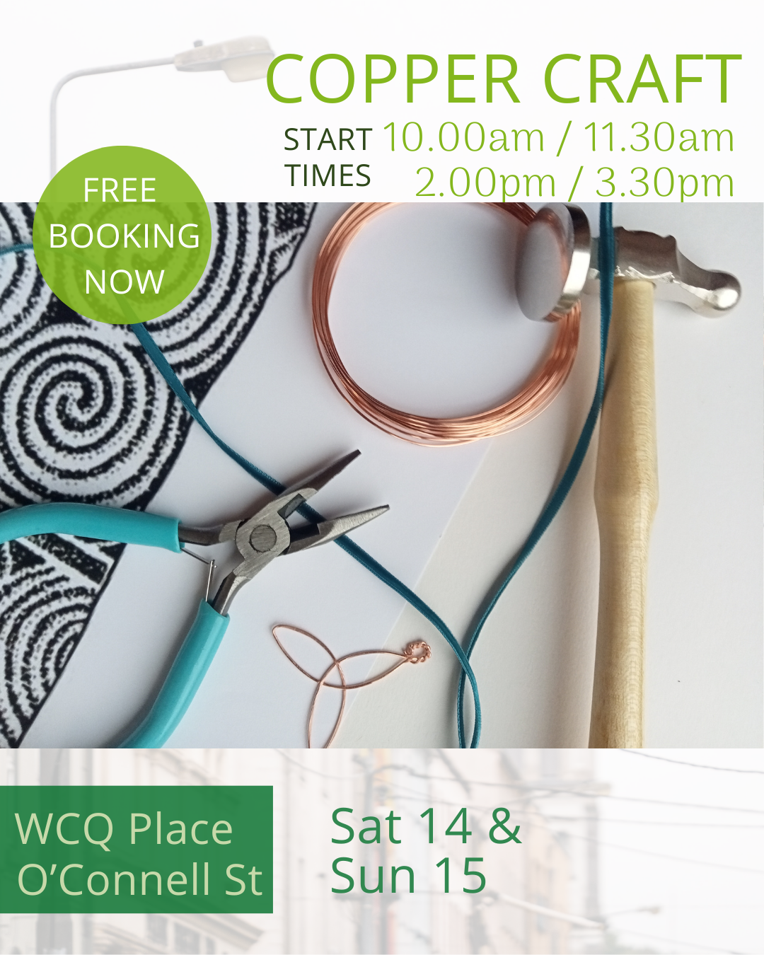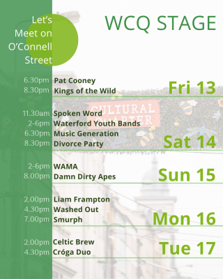 FREE events on O’Connell St in the heart of the Cultural Quarter include Celtic Copper Craft workshops on Sat & Sun in WCQ Place and a full 5-day line-up of live Music on WCQ Stage.